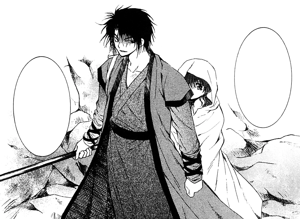 At Elder Mundok's suggestion of visiting the high priest of Kouka, Hak and Yona officially set off from Fuuga, Hak in particular slightly annoyed at the fact that his grandfather had little idea of the priest's whereabouts, and gave them a very broad destination. While on look-out, the ex-general explains vaguely that the priest had once been in a position of power at the castle, but eventually moved away from the populace due to Soo-Won's father, Lord Yu-Hon, who grew fearful of the priests' powers and suppressed them. Recalling Mundok's words, Yona wonders about the 'path' that the priest may reveal and also realizes how ignorant she is of the land that she was eventually supposed to rule. As Hak asks what they will do for sleeping arrangements when night falls and Yona catches him off guard by saying she'll snuggle next to him to keep warm, the ex-general becomes aware that there are people following them, and suspects an incoming attack. As they round the cliff-side, they come into view of Kan Tae-Jun's troops, who prepare to fight.