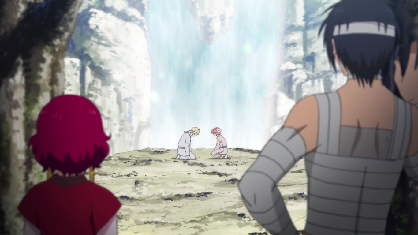 Ik-Soo appears behind Yoon again, and asks him once again about traveling with Yona and Hak, as well as noting how Yoon's sandals were starting to wear out. Yoon points that out to Ik-Soo also, and decides to make him another pair. When Ik-Soo becomes overjoyed with his sandals, he spins and moves around and nearly falls when he catches himself. Ik-Soo goes on to say that he can handle himself. Yoon confesses that if Ik-Soo told him to travel with the two, then he would, even if he called the princess naive, and ignorant of the world. Ik-Soo starts crying after seeing that Yoon will be leaving him, and Yoon starts tearing up a little also. Hak and Yona are behind the bushes not to far from them, observing and smiling.